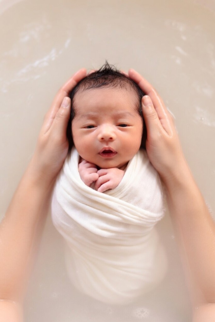 - Le bébé est doucement installé dans l’eau, souvent en position semi-fœtale
